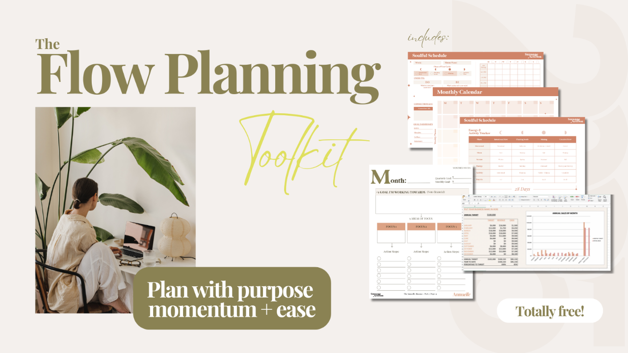 The Flow Planning Toolkit gives you everything you need to blend your strategy with an energy that helps you shine and makes reaching your goals each month more easeful!